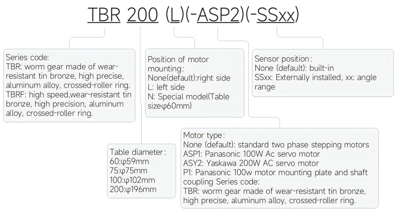 The TBR series stages are designed to meet the requirements of high precision, high rigidity, and high repeatability in industrial automation fields. The worm gears in the TBR series are made of tin bronze, offering excellent wear-resistant performance. The matched worm is made of stainless steel, treated with high-frequency quenching, providing high hardness and rigidity. A fine crossed-roller ring constitutes the main part of the guiding mechanism, offering high strength, high load capacity, and longterm durability. These stages can be operated horizontally, vertically, and even inverted. Higher motion accuracy is ensured by the finely designed inner shaft structure. Standard TBR series products employ worm gears with a higher transmission ratio, resulting in higher meshing accuracy but slower rotation speeds. The TBRF version runs faster than the standard TBR series by using a set of worm gears with a smaller transmission ratio.